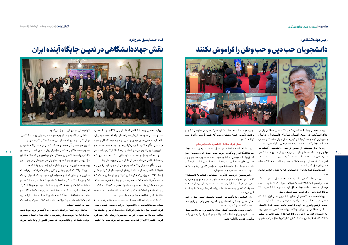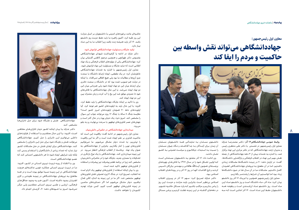 در این شماره، نمایش توانمندی‌های پژوهشگران و فناوران جهاددانشگاهی در نمایشگاه هفته پژوهش، دستورات معاون اول رئیس جمهور برای پیگیری و مساعدت با پیشنهادها و درخواست های جهاددانشگاهی، توجه بر بهبود ساختار سازمانی و ایجاد رضایت شغلی در جهاددانشگاهی، ورود زخم پوش‌های رویان به بازارهای جهانی، معرفی ۱۰ برنده پویش «یک کتاب، یک جمله» جهاددانشگاهی و معرفی «سامانه شهر دانشجو» به عنوان درگاه ارتباط دانشجویان با این نهاد مورد توجه قرار گرفته است.